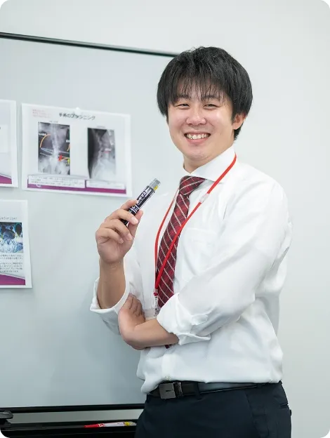 飛び飛びの「点」として覚えた知識が、つながって「線」になるのが面白いですね。例えば、手術の知識は手技書という参考資料を見て勉強しますが、最初は何が何だか分かりませんでした。でも、先輩に訊いたり、手術を見学させてもらって自分の担当した機械がどう使われているかを直接見たりするうちに、資料に書いてあったことや先輩が言ったことの意味が分かってきて、「自分の知識になった!」という手応えがあるんです。それから前職では効率を何より求められましたが、営業職は人柄で勝負できるのが魅力。自分で言うのも何ですけど(笑)。私のセールスポイントは笑顔で、人のために何かするのが苦ではないところも強みです。上司と同じように、ドクターのオーダーを受けるところからオペ完了まで一連の流れを自分で完結できるようになることが、今のところの目標です。
